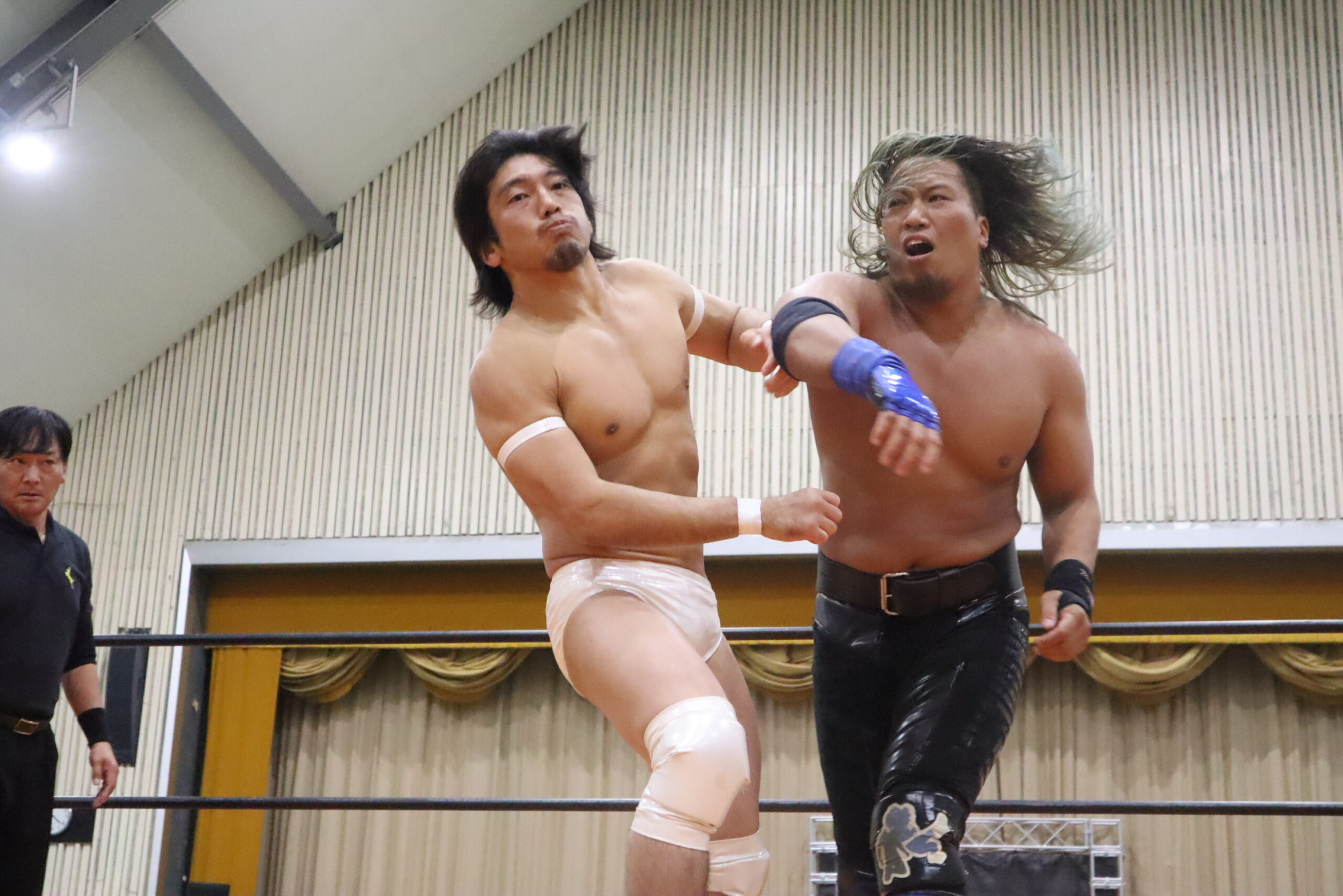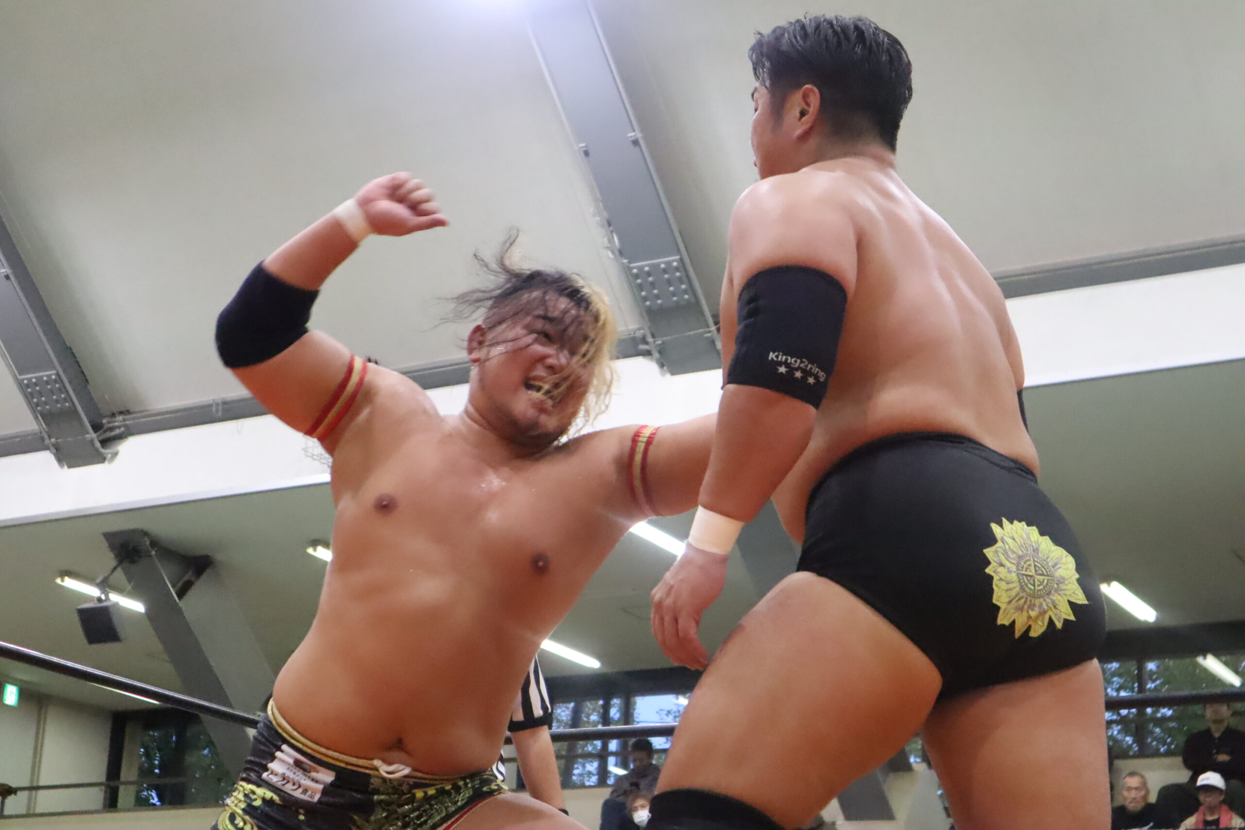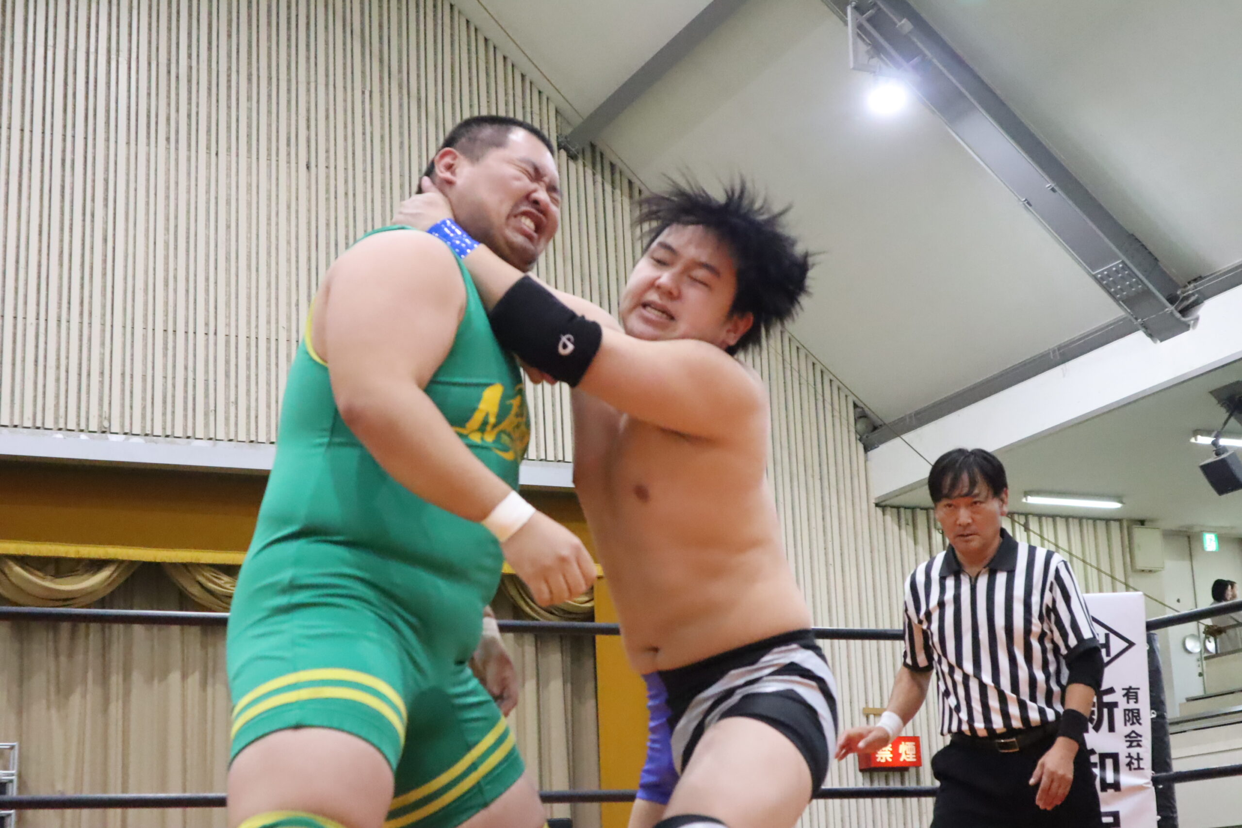 第2試合、コシ☆ヒカ〜ル&齊藤陽輝vs仲川翔大&井上彪流。齊藤と井上が試合前からバチバチに睨み合う。2人は序盤から激しいエルボー合戦を繰り広げる。仲川もこれに応戦し、齊藤に強烈なエルボーとドロップキックを見舞った。コシは仲川にクロスチョップからのおかわりコール!しかし仲川はかわしてコシにミサイルキック。齊藤は再び井上とエルボーを打ち合い、バックフリップを決める。そしてそのままスモウタックルで齊藤が井上から勝利!