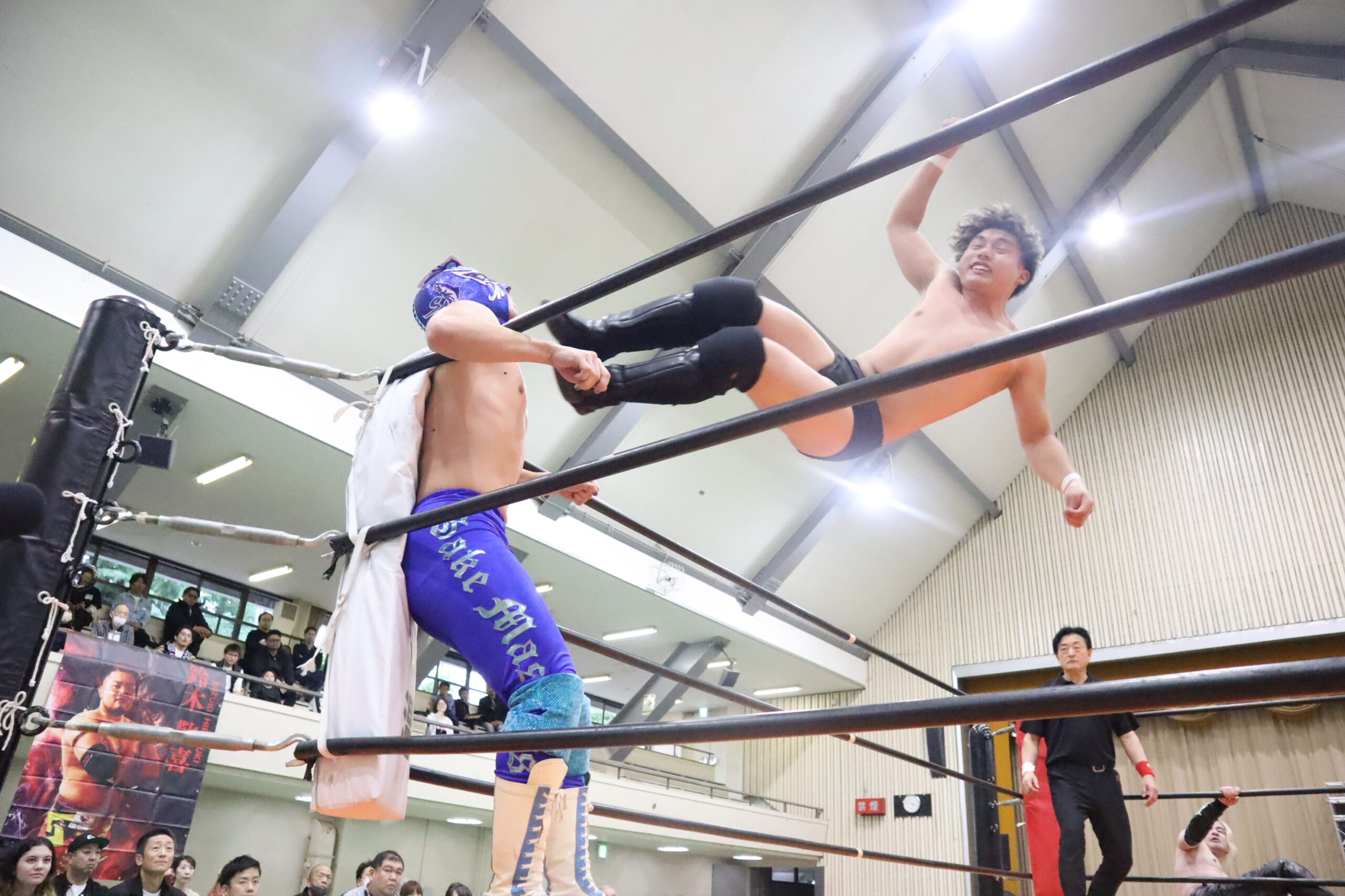 第4試合は中津良太&サケ•マスカラスvs木髙イサミ&渡辺大登のタッグマッチ。サケも渡辺も先輩レスラーであるイサミも中津に果敢に攻め立てる。しかし強烈な反撃をもらう。渡辺の串刺しドロップキックがサケに炸裂。サケもエビ固めで渡辺を苦しめる。中津と渡辺がミドルキックの打ち合いになるも、中津が蹴り倒す。最後は中津の垂直落下式ブレーンバスターを渡辺がもらい3カウント。
